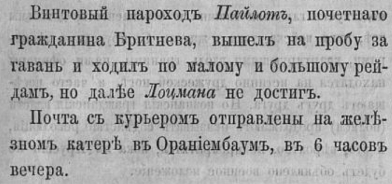 Билет на обычное судно до Ораниенбаума стоил 20–30 копеек. На «Пайлот», который шёл по льду, — 1 рубль.