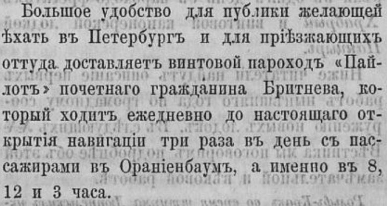 В 1862 году Бритнев запустил регулярное пароходное сообщение Кронштадт — Ораниенбаум.