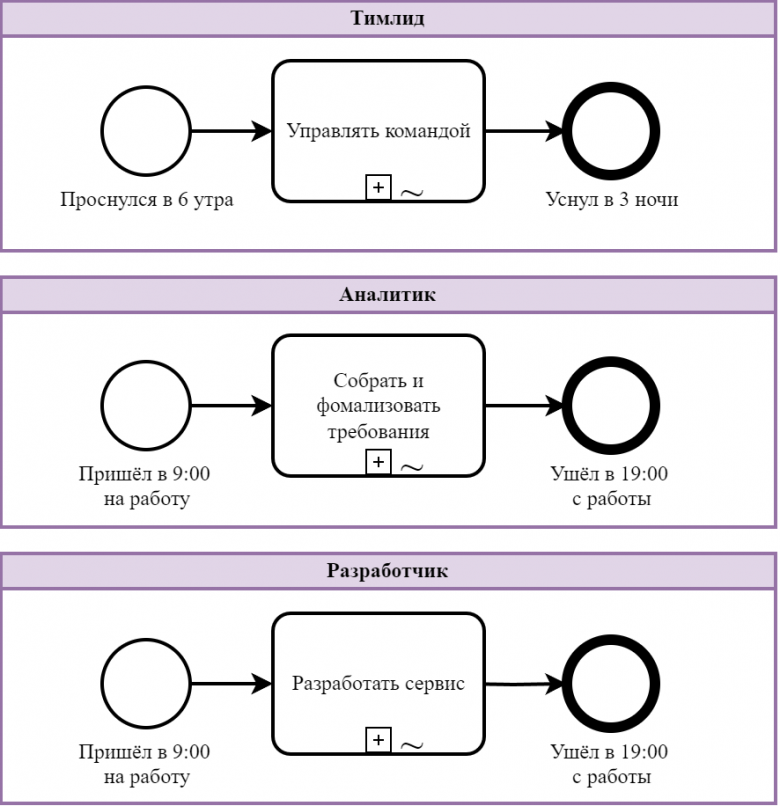Конечно, встречаются ситуации, когда схема работы команды выстраивается последовательно и напоминает «водопад». Например, при дефиците задач, когда тимлид их ждёт, а аналитик-стажёр не может работать автономно и требует постоянного микроконтроля. Или когда есть жестко регламентированный процесс (например, оказания государственных услуг). Однако это частные случаи, которые хорошо укладываются в базовые примеры из учебных курсов по BPMN. В данной статье мы их рассматривать не будем.