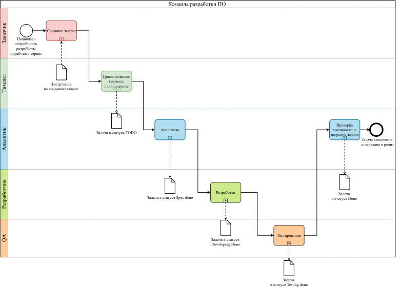 Заказчик, тимлид, аналитик, разработчик, QA, стримы и внешние команды – это разные пулы. Каждый придерживается своих ценностей и работает автономно. Ниже представлен пример значительно упрощенной схемы, отображающей работу участников над задачей.