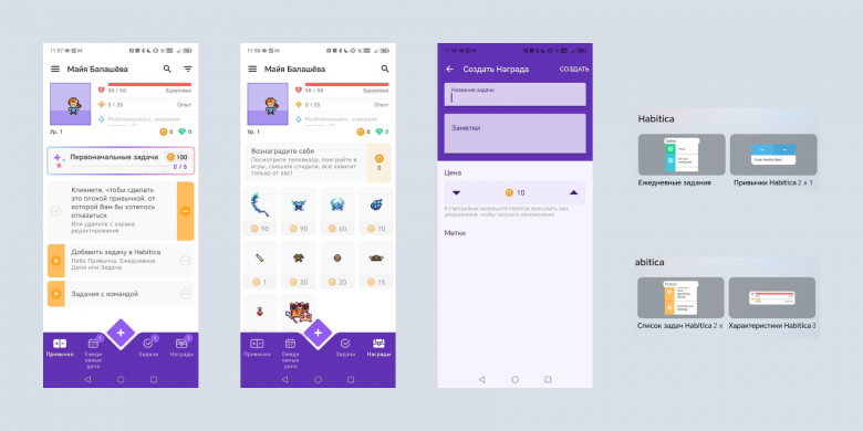 На Android Habitica — полноценное приложение со всем функционалом веб-версии. Управлять задачами и прогрессом персонажа удобно, интерфейс яркий и намеренно «игровой» — здесь всё сделано не для контроля, а для вовлечения.