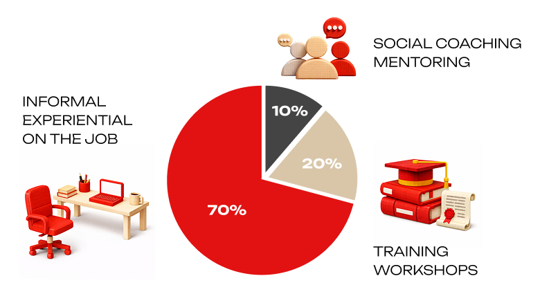 20 % — обучение через взаимодействие (наставничество, обратная связь, нетворкинг);70 % — обучение через опыт (рабочие задачи, проекты, эксперименты).