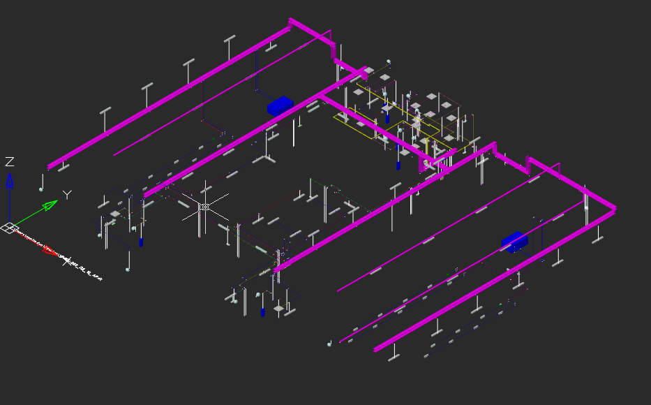 В рамках реконструкции объекта — одноэтажного здания собственного назначения с выходом на чердак и определенным набором сантехнических приборов, технологического оборудования и систем вентиляции — нам предстояло спроектировать сети силового электрооборудования и системы электроосвещения. Горизонтальная разводка распределительных линий предусматривалась открытой в лотках в помещении электрощитовой. Сети освещения в зоне досмотра должны быть скрыты за подвесным потолком в ПВХ-трубе и лотке, в электрощитовой — располагаться открыто в лотке. Групповые силовые сети должны идти от групповых щитов в металлическом лотке за подвесным потолком, опуски — скрыто в штробе. В качестве кабелей, питающих линии и групповые сети рабочего и аварийного освещения, предполагались кабели ВВгНГ (A)-LS и ВВгНГ (A)-FRLS; питающих сети и распределительные линии остальных электроприемников — ВВгНГ (A)-LS. Основную сложность представляли прокладка кабельных линий и увязка системы электроснабжения со сводными разделами для автоматической проверки в случае внесения изменений в проект.