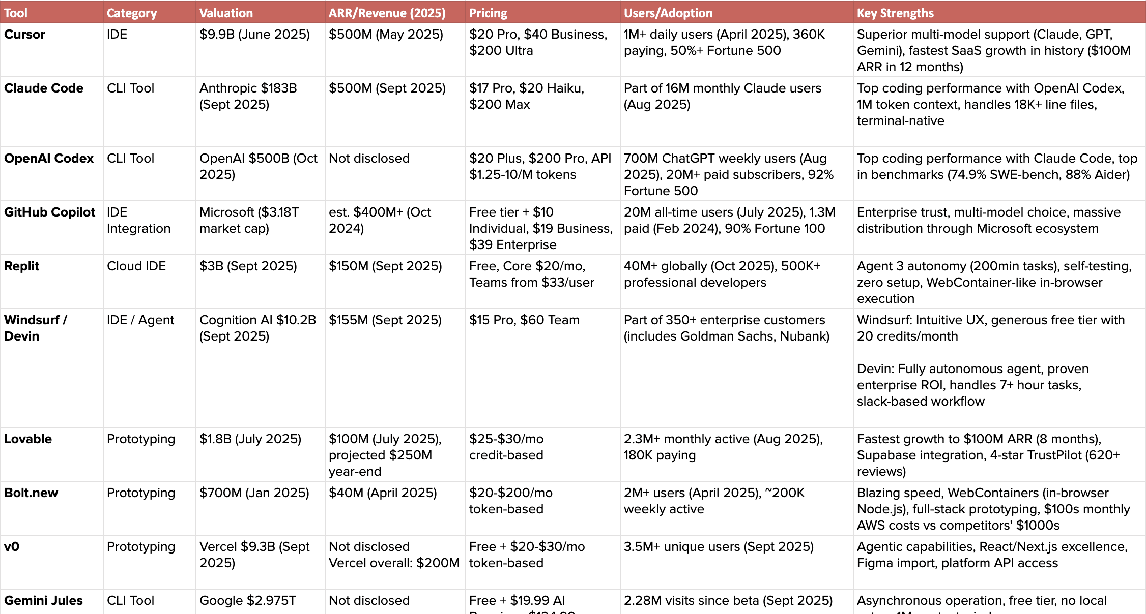 В начале 1950-х Грейс Хоппер ввела термин «компилятор» и создала одну из первых его версий — систему A-01. Появившиеся позже компиляторы скрывали машинный код и позволяли программистам сосредоточиться на более высокоуровневой логике, а не на низкоуровневых деталях железа. Сегодня AI-ассистенты для программирования2 запускают похожую трансформацию: они позволяют инженерам сосредоточиться на задачах более высокого порядка, генерируя код из запросов на естественном языке. И большие технологические компании, и хорошо финансируемые стартапы сейчас борются за то, чтобы занять место в этой новой волне. Вчера Google анонсировала Antigravity — своего нового AI-ассистента для кодинга, а позавчера AWS объявила о доступности своего инструмента Kiro. На прошлой неделе Cursor, самый яркий стартап в этой области, привлёк $2,3 млрд в раунде серии D при оценке в $29,3 млрд.