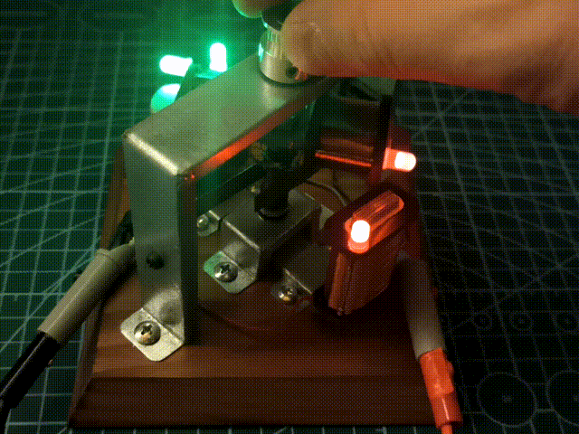 Я практически один-в-один воспроизвёл моторчик из книги. Единственное, что я решил добавить для наглядности - это двухцветные светодиоды, которые загораются либо красным, либо зелёным, в зависимости от направления тока через катушку. Это особенно пригодится во втором моторчике, но об этом потом. Как можно видеть на видео, ток через катушки всегда течёт в одном направлении, единственное, что не непрерывно, а только когда пружинка касается рамки на якоре.