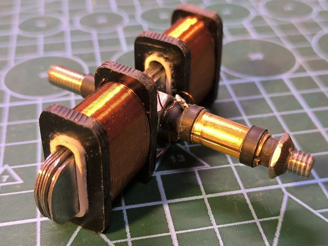 Смысл простой: у нас есть пара катушек (вообще, хватило бы и одной, но симметрия - наше всё) и простой стальной якорь. Если катушки включить, то якорь к ним притянется ровно так же, как и стрелка компаса выравнивается в магнитном поле Земли. Смотрите: